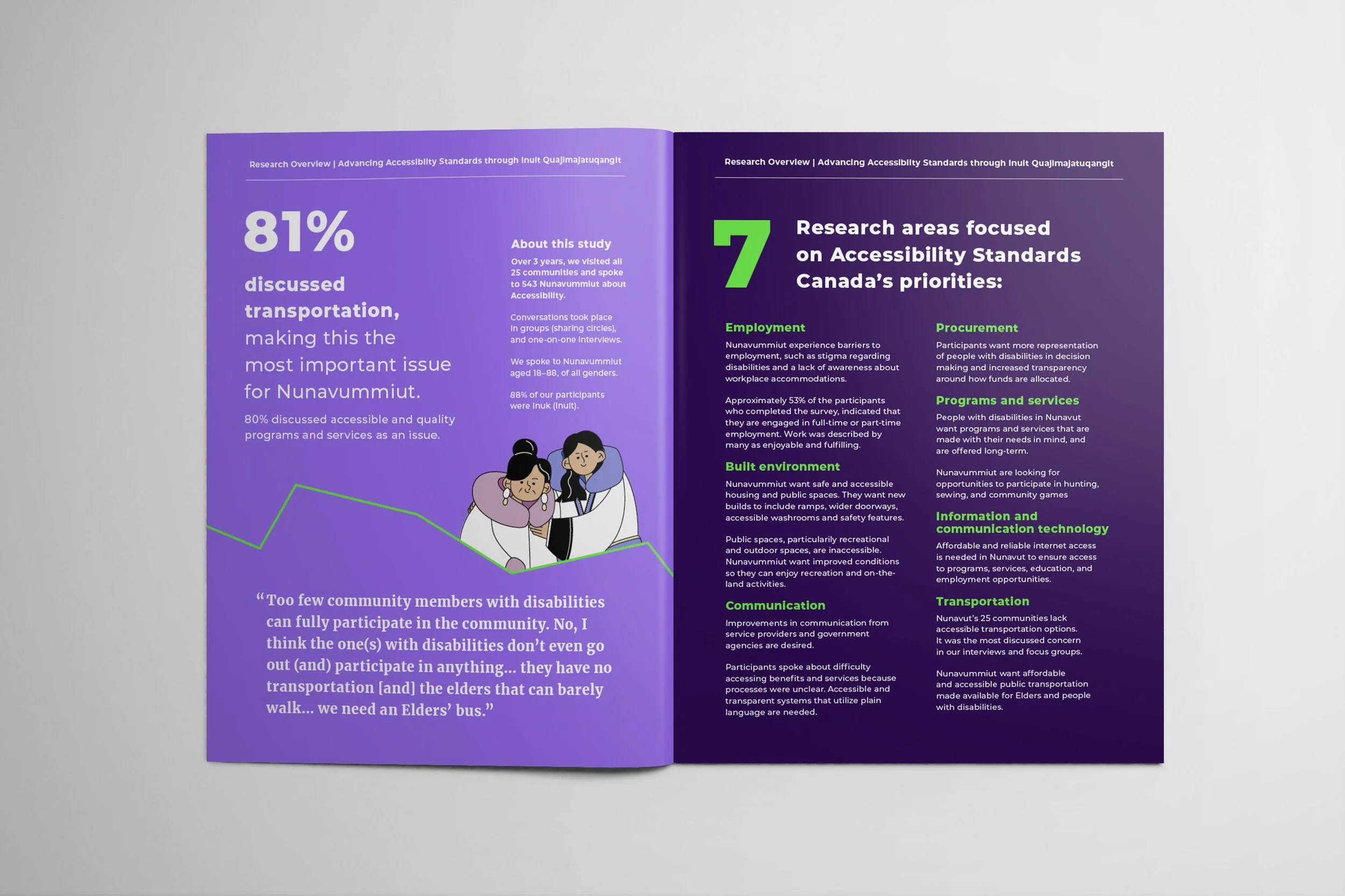 In 2023, NDMS approached us to create culturally sensitive infographics, data visualizations and illustrations that tell the story of Nunavummiut with disabilities. Michelle creatively directed Amy Ryu to illustrate Eeta, a persona of a young woman with a disability living in Nunavut. Through storytelling we depicted the challenging medical travel journey of Eeta, an experience that is very common to Nunavummiut with disabilities accessing healthcare within, and outside, their territory.